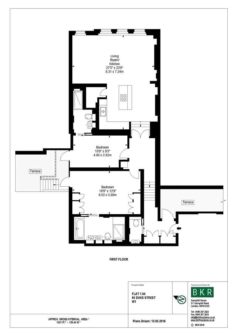 This two bedroom apartment (1,501 sq ft / 139 sq m) is situated on the first floor of 65 Duke Street, a six storey Grade II listed building in Mayfair with lift and concierge. Moments from Selfridges department store, the building comprises sixteen luxurious one, two & three bedroom apartments over four upper floors, newly refurbished and presented to the highest standards. The apartment benefits from wood and stone floors, comfort cooling, a Creston home automation system and Miele integrated kitchen appliances.