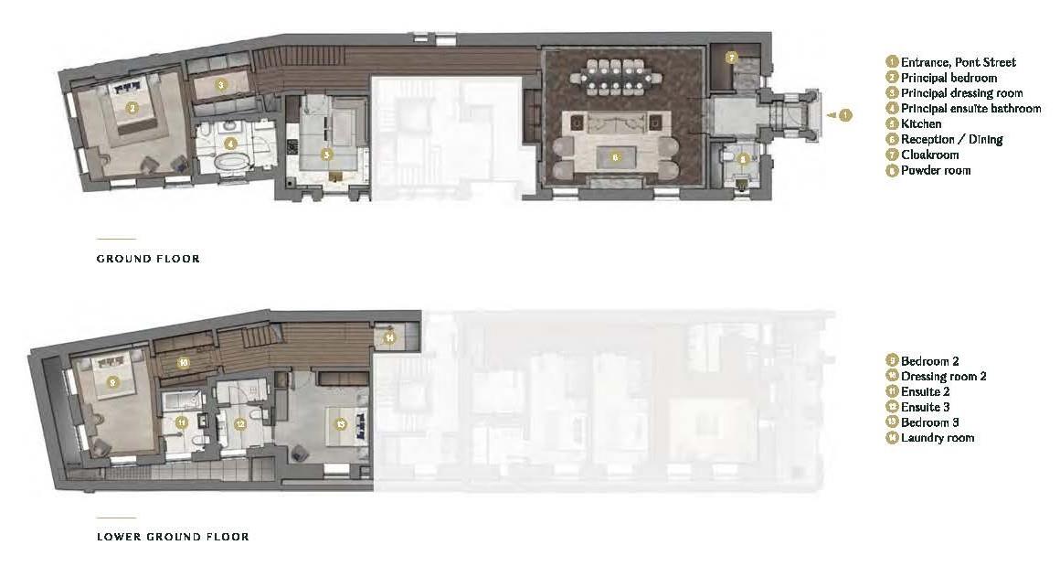 This exquisitely designed 3-bedroom duplex apartment (2,644 sq ft / 246 sq m) benefits from a private entrance on Pont Street and offers beautifully proportioned spaces including three en suite bedrooms and a magnificent reception dining room with 3.2-metre ceilings.